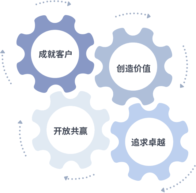 成就客户是一切决策的出发点,,,,创造价值是衡量所有工作的标准,,,追求卓越是我们做事做人的态度,,,开放共赢是我们的格局也是最终的结果。。。价值观的齿轮环环相扣,,,推动着组织里的每个人不断向前。。