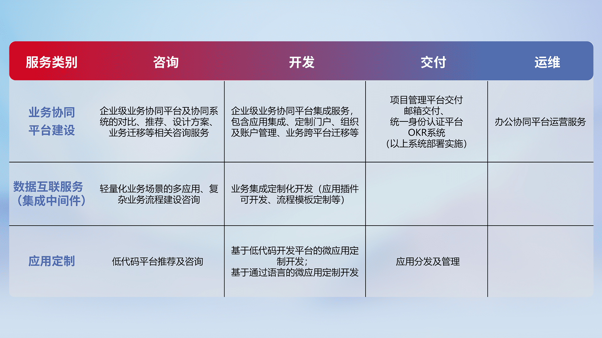 针对钉钉、、、、企微、、、IDaas等平台级产品提供产品的规划、、、、方案、、、、交付、、、、定制化开发等服务,,,实现如统一协同办公、、智能客户服务、、、混合会议管理、、、智能数据查询、、等业务场景,,,,实现数字化转型。。。